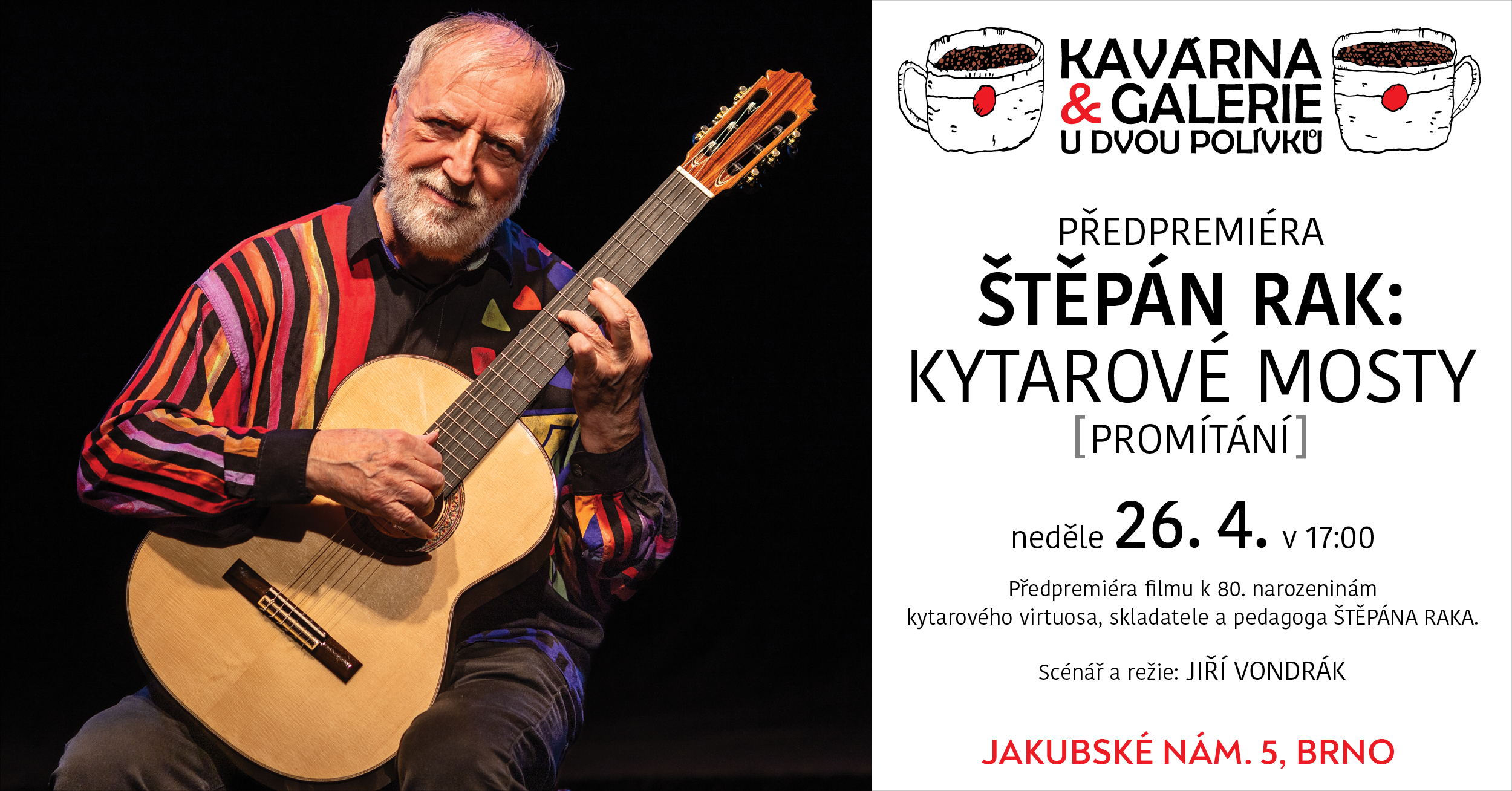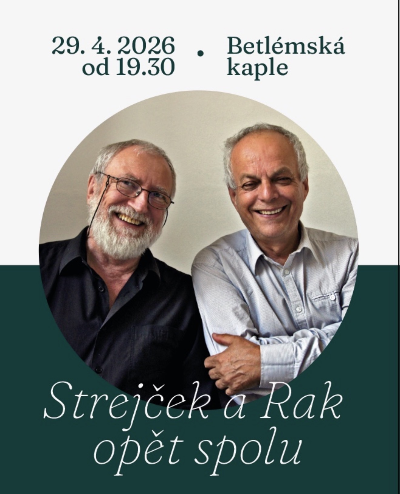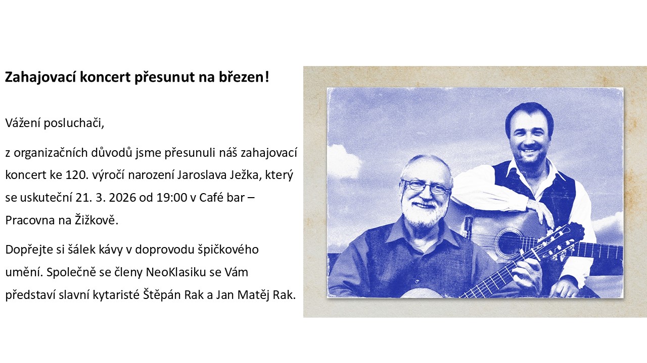 "STREJČEK A RAK OPĚT SPOLU"Jedinečné vystoupení Alfreda Strejčka a Štěpána Raka - k 85. narozeninám Alfreda Strejčkahosté: komenioložka PhDr. Markéta Pánková a kytarista Jan-Matěj Rak